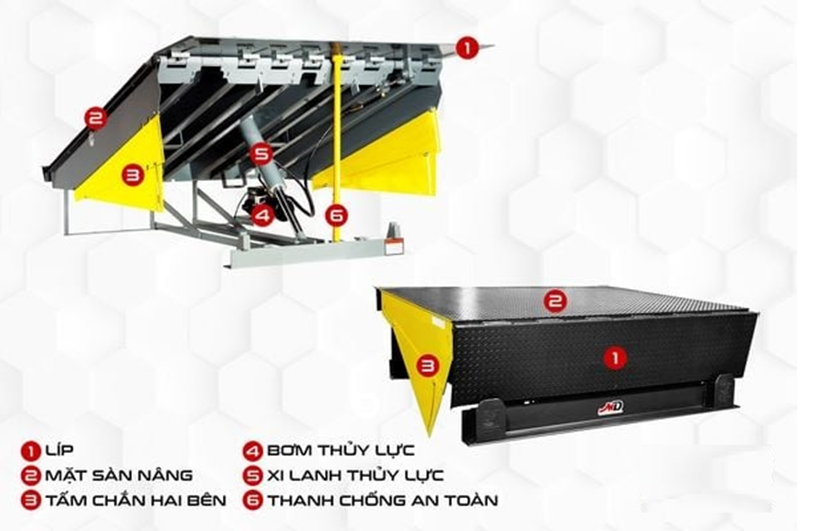 Sàn nâng thuỷ lực được nâng hạ bằng hệ thống thủy lực. Cấu tạo của sang nâng thuỷ lực cụ thể như sau: